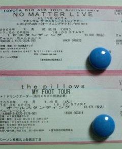 頭の中をエルレのSpace Sonicがぐるぐる、ぐるぐる。朝っぱらから、ジャングルぐるぐる。この前、ACIDMANの特別番組を見て、アルバム聴きたいなと。あのかすれ声がいいかんじなんざます。でも多分、レンタできるだろうから、それまで待て。(笑)っつーことで、OCEANLANEの2ndアルバムを購入。とっても聴きやすい。とゆーより全部同じに聴こえます。(笑)でも大好き♪♪1stのスペシャルエディションを探しているのだが、売切状態。なので、ヤフオフで検索かけるも、高いんだな。ちくしょーっ、発売後すぐに買うんだったぜ。あーあ。いっつもこんなかんじ。買うの迷ってるうちに売り切れちゃって。どーでもいいものばっか買っちゃって。どうにかならんもんですかい?pillowsの先行チケが取れたので、早速ローソンで購入。でへへ~~顔がニヤけてしまいますな。無くさないよう、冷蔵庫にぺたし。いけてねぇ~~。(^_^;)でもいいのですっ。他に貼るとこないですしぃ。ぴろチケ&てなーチケTOYOTA BIGAIRのイベントらしいッス。