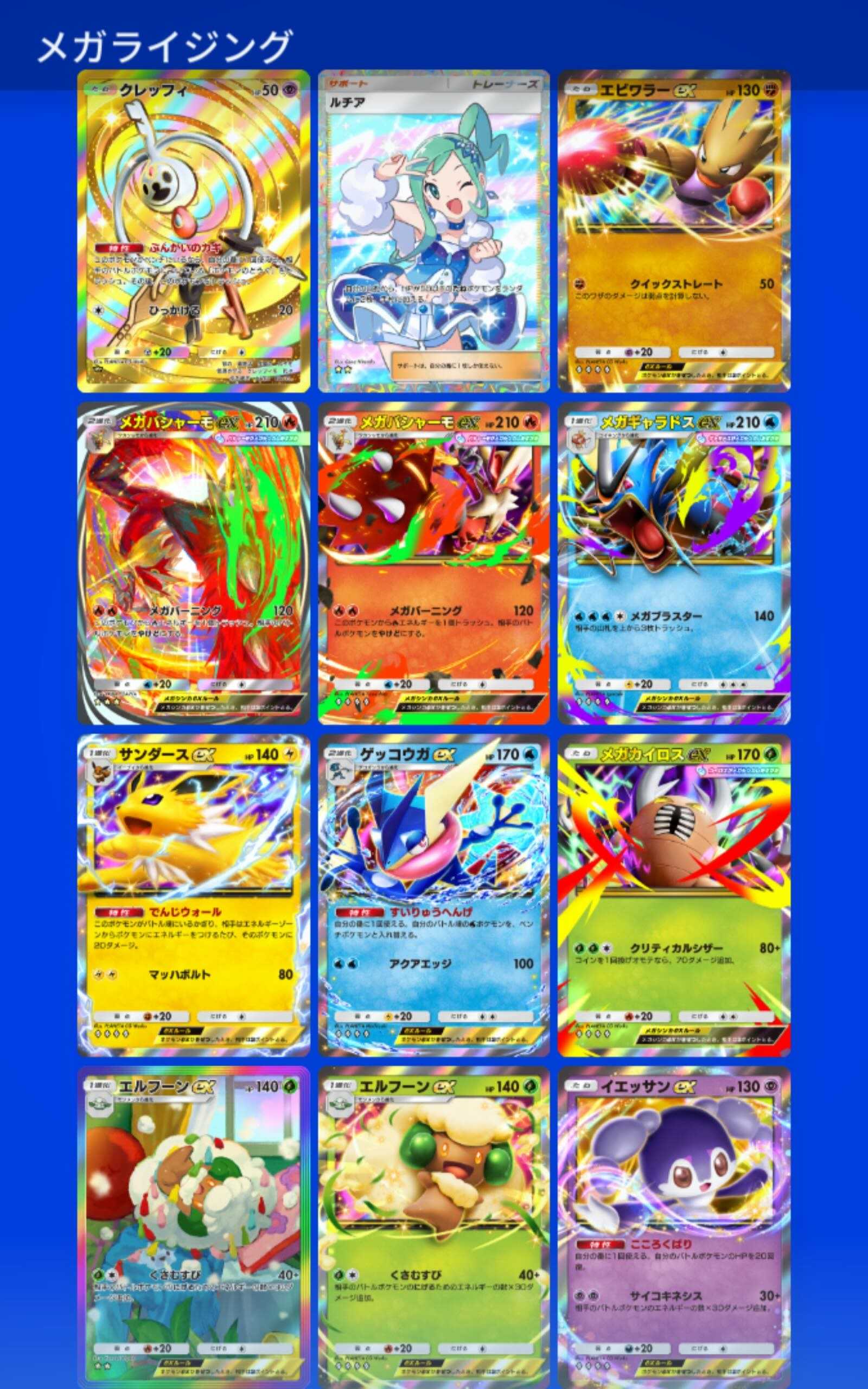 メガライジング 環境で本当に使えるカードを紹介します。1位 ハルカ手札のポケモン2枚と山札の2枚を交換できます。これ、手札が1枚でも2枚のうちから1枚選べるので、ポケモン通信の上位版です。2位 ゲッコウガexバトル場とベンチのポケモンを交代できます。どのポケモンでもOKなので、テッカグヤの上位版です。テッカグヤと違って、コインなしで100ダメ出せるのも良いです。3位 オボンのみHPが半分以下になったら、30回復できる消費アイテムです。これがなにげに使えます。4位 フレイムパッチ1ターン目で仕方なく出したポケモンにエネを付けて、2ターン目で逃げて1エネを消費し、本命ポケモンに付け替えることで無駄を省けます。