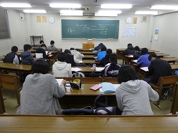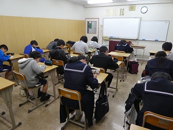 新中1の単語テスト,Aクラス前回は全員満点だったのに,今回は2名脱落~!(写真はAB合同国語)304教室。以前は固定机でした。