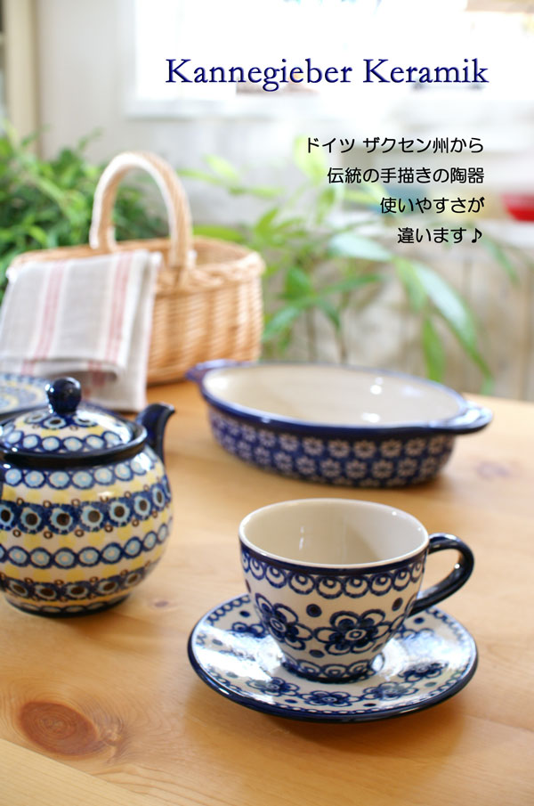 このコーナーでは、品質、こだわり、コストパフォーマンスなど様々な要素を総合評価して店長お勧めの逸品のご紹介です♪今回はドイツ、ザクセンの伝統技法ブンツラウワー(ブンツラウアー)様式のお話。聞いたこと無い、って人も意外と多いと思います。なにせ日本で輸入・紹介されている窯元も少なく、お取り扱い店もとっても少ないのが現状。ではブンツラウワー様式とはどんな様式?これは実は絵付けの仕方にその特徴があります。素材は陶器。その上にフランスの一部のカフェオレボウルでも見られるスポンジでの絵付け。ただ小さなパターンを繰り返して全体の絵付けをしていくのがブンツラウワー様式の特徴。これ全部手作業、時間のかかる絵付けです。そしてもう一つは刷毛塗りの併用。スポンジだけで表現できない部分を手作業による刷毛での絵付けで補います。この全部、手作業による絵付けが。皆さんが口にする「何とも言えない暖かみと親しみやすさ」の秘密。日本でのお取り扱いは非常に少なく楽天モールでもあまり見かけないようです。老舗の窯元は現在二つ;カンネギーサ陶器ハイゼ陶器カンネギーサ陶器は当店でも数年前から少しずつラインナップを増やしていったアイテム。そして今月、ハイゼ陶器のお取り扱いを開始♪一気に60点以上のラインナップを揃えました。いずれも、ブンツラウワー様式の基本中の基本とも言える、アイボリーの下地にブルーの彩色という基本はそのままに実に多彩なデザインを生み出しています。200年近い歴史を持つ老舗達の陶器にはもう一つの良さ、それが形の使いやすさ。長い年月にわたって熟成されてきたその形には実際に使ってみて初めて分かる使いやすさが♪それもブンツラウワー様式の陶器の息の長い人気の秘密!