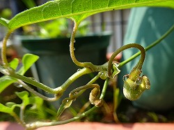 晩春から初夏に、基部が心形で両側が耳状に張り出した葉のわきから出した花柄の先に、3枚の紫褐色のガク(萼)が合着して筒状になった薄い黄緑色の花弁のない花が咲きます。誕生花のない花は、不思議な形をしたユニークな花、アリマウマノスズクサ(有馬馬の鈴草)。花の名は、牧野富太郎博士に有馬温泉の近くで発見され、ウマノスズクサは葉が馬の顔の形に似ていて、花の球形の部分が馬の首に掛けるような鈴に似ていることから名づけられました。ウマノスズクサの由来は実の形が馬の首に掛ける鈴に似ていることからという説、花の形が馬の首に掛ける鈴に似ていることからという説などもあります。 花言葉「ユーモアのある」は、ウマノスズクサ(馬の鈴草)と同じ花言葉で、花弁が無く萼がラッパ状になって基部が丸い特異な花の形からつけられています。花言葉「親切な人」は、花の中に臭いにつられて中に入ってきたコバエを閉じ込め、コバエが花粉まみれになったら開口して逃がしてやることからきているのでしょうか。 アリマウマノスズクサ(有馬馬の鈴草)は20年前の初夏に、地元の山野草展で名前にひかれて連れ帰って5年後に花を一輪咲かせましたが、その後ずっと花を咲かせていません。鉢植えとフラワースタンドを処分した今は、花木の下に植え替えると根元を這い伸びているので、植え替え場所はここでもいいのかなと思いながら、巻きつけるように手ごろな支柱を立てました。ウマノスズクサ科ウマノスズクサ属、耐寒性つる性多年草、原産地:日本、中国別名:バトウレイ(馬兜鈴)、セイモッコウ(青木香)アリマウマノスズクサ(有馬馬の鈴草)の花言葉:ユーモアのある、親切な人。アリマウマノスズクサ(有馬馬の鈴草)の誕生花:―流通時期:ポット苗を春に見かけました。園芸ネット プラス、charm 楽天市場店、遊恵盆栽 楽天市場店、やましち山野草店、日本花卉ガーデンセンター annex、ガーデン・チコリ 彩乃里さんにあります。