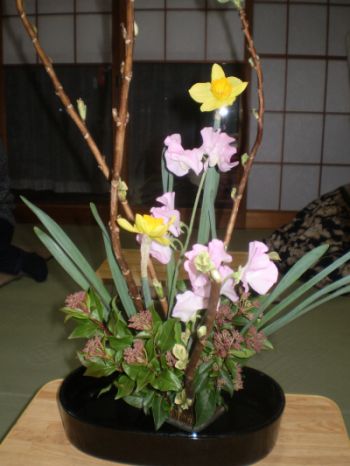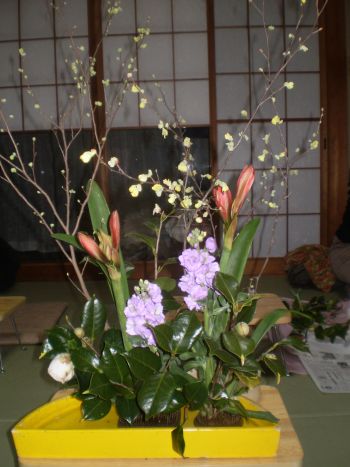 1月のお花のお稽古は2回で今日がその日だった。遅い時間に先生宅に伺ったら既に何人かお稽古していて、他の人の作品も見られてよかった。今日の花材はあじさいの枝3本、水仙(黄色)3本、スイートピー(ピンク)2本、がまずみ2本だった。スイートピーが春らしく黄色の水仙と上品にマッチしている。いつもの奇想天外な花の取り合わせとは少し異なっていて、仕上がりはともかくとして、お花をお稽古したという気持ちになれ、気分的に落ち着いた。 これで花代が1250円ということである。いつもは月3回のお稽古で1回の花代は1000円である。いまどき1000円で花を何種類か取り合わせて花材にするのはかなり金額的に厳しいと思う。これまでの花材が貧弱だったのもある意味仕方がない。250円の差でまるっきり花の雰囲気が違っている。花代を1回1500円にして月3回お稽古、月謝混みで10000円はどうかという案も出ているらしい。現行の8000円というのと10000円ではお稽古に費やす金額の印象が違う。10000円を高いとするか当然と考えるか、他の皆さんがどう考えるだろう?。アンケートか何かでみんなの意見を聞くと言う結論になった。私はどちらでもよい。花材がよくても自分の腕がなければ勝負にならないから。しかし、いずれにしても度を過ぎた和洋混在、新旧ミスマッチ、奇天烈な花材の組み合わせはお断りしたいというのが正直な気持ちである。