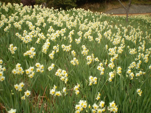 12時5分に保田駅に到着したら、裏鋸とはうって変わってたくさんの人たちがいた。水仙祭りが開催されていて水仙を観にきた人たちである。ベンチで昼食を済ませ、今度は保田駅から安房勝山駅まで山間の道を巡る水仙ロード周遊のコースにスタートした。歩き始めると道の両サイドにすぐ水仙が姿を見せる。江月水仙ロードの始まりである。水仙は一輪一輪はとっても小さいのだがそれが密集して斜面が薄クリーム色になっている。水仙の花は好む向きがあって全員(?)が一様に同じ方向を向いて咲いている。もちろん好きな方向はお日様が照る方向である。自生する水仙は香りが高い。気高い香りが漂う中、たくさんの人と行き交いながら小一時間で水仙広場に着く。ここで水仙祭りが行われており、お土産も売られていて賑わっている。水仙10本で100円である。甘酒を飲んで再出発。ここから10分ほど登った地蔵峠付近はもっとすごい水仙数で斜面の上も下も水仙で埋め尽くされていて、その中を人が歩いている。 地蔵峠から観る水仙の大群落山のピークを越えても尚も水仙が続く。どんだけ!!と言う感じなのだが見飽きない。地蔵峠を過ぎると極端に人がいなくて、独りで延々と安房勝山まで歩き続けた。いやあ、すごい水仙だ。パンフレットに一億本の水仙の香りとあり、いくら何でも一億本は言いすぎだろうと思っていたが、一億本はあると思わせるほど莫大数の水仙が斜面を白で埋め尽くしていた。もちろん切花用に栽培もされている。日差しは今一だったものの、さすがは房総、草や花や風物が同じ千葉県でも私が住む県北とはかなり違っていて自然の恵みや早い春の訪れを十分感じ取ることができた。保田駅を中心にして午前中は裏鋸を4時間余、午後は水仙ロードを3時間と今日はけっこう歩いて充実した。やはりこれ位歩かないと私の脳はセロトニンのバランスがとれないのだと実感する。いい一日だった。東京湾に沈む夕日を見ながら鈍行列車に揺られて帰った。