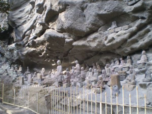 千五百羅漢は表鋸山頂から日本寺に下る崖の中にある。2年前はじめてこれを見た時そのすばらしさに驚愕した。今回裏鋸をハイクに選んだのにはこの羅漢を再度見たいという気持ちがあった。私はものに接するとき、事前に知識理解を入れない。著名な人物がすばらしいと書いていればそれはすばらしいという先入観で観てしまう。そうではなく自分の感性でものを見たい。それでこの羅漢についても全く予備知識無く、2年前下山途中に通りすがりで観たのだが非常にすばらしく、さまざまな興味が湧いたので少し調べてみた。それによるとこれは曹洞第九世、高雅愚伝禅師の発願により、上総桜井(現木更津市)の名工、大野甚五郎英令が1779年から1798年に至る21年間、門弟27名と共に生涯をかけて1553体の石仏を刻み、太古よりの風蝕によってできた奇岩霊洞の間に安置し奉ったものであると記されていた。謎が解け理解が深まった。一箇所づつ足を止めて丹念に見た。言い知れぬ感動を感じた。 いわゆる芸術品ではないから素朴なものが多い。しかしその数の多さ、種類の豊富さ、大きいものから小さなもの、像のとるさまざまな姿勢、仏像には見られないニュアンスに富んだ表情、手足の組み方、手にする持ち物など実に多彩で訴えかけるものを感じる。いわゆる仏像となるとその一定様式になってしまうが、ここの羅漢様はけっこう自由で野仏的な自由さを持っている。 さらに頭部のないもの、壊れかけのものなどもかなりあり、とても痛ましいが何か惹かれて見つめてしまう。200年以上の風雪にさらされ頭部や腕を失いながらも今なおそこに存在する石仏群!!心の奥がしーんとなってしまった。 日本寺という寺の歴史と価値を発見し、これらの羅漢様を風雪にさらしておいていいのかという気持ちを抱きながら保田駅むけて独り歩いた。