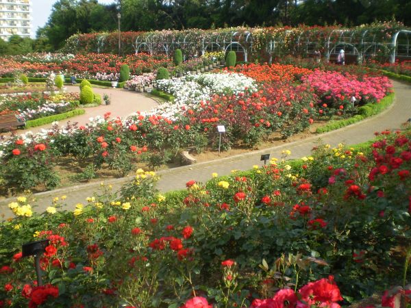 からりと乾いた空気の中、すっきりと青空が広がる五月らしい一日だった。谷津バラ園にバラを観に出かけた。谷津バラ園には世界各国のバラ700種類、7000株がある。今日はほぼ満開で園内はバラの高雅な香りが漂っていてすばらしい別世界だった。 一面のバラ・バラ・バラ・バラと大バラアーチ 輝く色とりどりのバラの向こうにはつるバラの巻く白いパゴラも見える 炎のように燃える赤 グラデーションをつくって咲くバラ園は皇室王室、有名人、新品種、香りの庭、青バラ、イングリッシュ・ローズ、鈴木省三、高松宮などの各コーナーに区切られてテーマごとにまとまっている。花のネーミングも大変工夫されていて興味深いものがあった。明日から2,3回に分けて紹介しますのでお楽しみに。