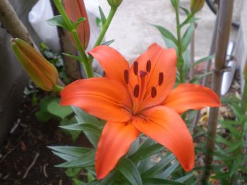 今日も雨、雲が立ち込めた空から静かに雨が降ってアスファルトを濡らしている。バラに気をとられていたが、いつの間にかユリも咲いていた。何の手入れもしないのだが球根の強さで芽を出し花を咲かせている。ありがたい。沈んだ空気の中に朱色の花がアクセントになってそこだけ華やいでいる。