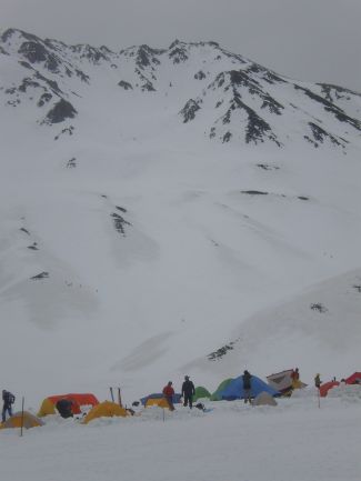 5月4日6時朝食、7時出発。曇り空であるが、徐々に下り坂の兆候を感じる。最終日になった。名残惜しいが再訪を確信して小屋を後にする。朝のさわやかな剣沢をアイゼンを効かせて黙々と登る。「グワ、グワ」とお世辞にもきれいとは言えない声で雷鳥が鳴きながら雪の斜面を歩いている。保護色で真っ白な体であるが、どこかにわずか色がついていて識別できる。剣御前小屋のある別山乗越を過ぎ一気に雷鳥坂を下って雷鳥平で一休み。アイゼンを外して身軽になる。連休が続くため登山者が下からけっこう登ってくる。 雷鳥平のテント場 登山者やスキーヤーの姿が続く室堂方面室堂まで戻ると往路に倍するものすごい観光客がいた。午前中はまだ混まないだろうという予測を覆して、ターミナルは人であふれていた。下に下りれば降りるほど人の混雑は激しく、黒四ダムのコンクリートの上に乗り物を待つ人々が長蛇の列をなしていて驚いた。 緑の黒部湖と後立山連峰とケーブルさっさと歩こうにも人ごみで歩けなかったが、次々と乗り物を乗りついて扇沢に着いた。ここからの混雑もあるので、あちこち立ち寄らないでダイレクトに帰京することになった。この判断が正しくて7時前に帰宅でき、このブログもアップできた。今回はとにかく肩が心配だった。冬山用ザックを背負って行動して肩がどうなるか。右手でピッケルをしっかり突けるか。でもどちらとも杞憂に終わった。3日間とも肩は痛まなかった。夜明け前の痛みがあるのは仕方がないとして、なかなか良い回復状態と判断してよいのではないか。努力は人を裏切らない。(自画自賛です)それより脚が筋肉痛になった。こちらのトレーニングがおろそかになっていたかも。でもこれならアルパインに出られそうな気がする。今年一番の充実感と達成感にあふれた3日間であり、希望の灯をともすことができた剣山行だった。