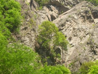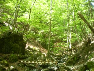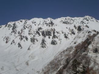夏のような日差しが降り注いだ今日、1年ぶりに越沢バットレスに行った。背丈の高くなった草を踏み分け、涼しげに水が流れる沢を見ながら丸木橋を3回渡って岩場に着いた。最初に一般ルート4ピッチを攀った。久しぶりのマルチでスムーズにできるか心配だった。やはり「メインロープにクローブヒッチでセルフビレイして」と言われて、クローブヒッチの結び方が瞬間的に閃かず記憶がよみがえるのに時間がかかった。 越沢バットレス全景 第二スラブの登攀しかしそれを思い出した後は大丈夫だった。40mと30mの懸垂下降がありそれも不安だったが、1回やってその感覚を思い出すと慣れてきた。次に第2スラブ4ピッチを攀った。高度感のある岩の上から見下ろす木々が実にさわやかな若い緑色で清新だった。昨年同じルートを登攀した時は初めてのマルチで一生懸命だったが、今日は少し余裕があった。岩を楽しみ、マルチを復習して次に備えることができ、楽しい一日だった。