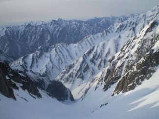 5月3日午前2時起床、2時50分出発。スパッツ、アイゼン、ハーネス、ヘッドランプを着け小屋前から剣沢雪渓を下り始める。ヘッドランプだけなのでうす暗くてよく見えないがかなりの急斜面、雪がしまってアイゼンがよく効く。9ヶ月ぶりのアイゼン歩行であることを十分自覚して慎重に慎重を重ねて下る。途中源次郎尾根に取り付く人たちのランプが見える。その平蔵谷を左に見て更に下りに下って長次郎谷の出会いまで下る。ここから長次郎谷を登り始める。一歩一歩暗い雪面を見ながら黙々と歩く。途中デブリがあって雪の塊が散らばる中を歩く時は脚が短い私は苦戦を強いられた。4時過ぎから明るくなりヘッドランプをはずす。登ってきた反対側を振り返るとものすごい急斜面、我ながらこんな坂よく登ってきたなあという感慨がわく。谷のはるか向こうには後立山連峰がくっきりと広がっている。 急峻な長次郎谷 後立山連峰が広がる 天を突く鋭い岩峰とV字に切れ込むコルが連続する八峰ストックをピッケルに持ち替え、途中5.6のコルを右に見てなおも長次郎谷右股を詰める。闇が去り雪面の白さがすこしづつまぶしくなる。鋭い岩峰の稜線がはっきり青空を突いている。こういう景色が大好きだ。熊の岩を過ぎ、やっと池の谷乗越に到着。細い稜線に昨夜ビバークしたのであろう、雪を四角に切って風除けが作ってあった。ここで休憩20分。北アルプスおよび裏剣側の大景観が惜しみなく展開していてすばらしいことこの上ない。源次郎尾根の1峰、2峰、懸垂下降点などもよく見えた。いくつかのパーティが豆粒のように見える。 大きく迫る八峰の岩峰と後立山連峰池の谷乗越から剣本峰に続く急斜面にトレースが点々と残されている。いよいよ剣をめざして最後のピッチである。ここでガイドとアンザイレンしヘルメットも被る。斜度が大きいためピッケルをダガーポジションにして雪面を這うようにして登らねばならない部分もあった。でも稜線にでるとものすごい絶景で、そのヨーロッパアルプスのような景観に私はもうわくわくして興奮してしまった。剣山頂までの稜線歩きは圧巻で本日のハイライトだった。でも稜線がとても細く滑落すると終わりなのでガイドから「足元に集中して」という注意が何度もあった。何度か登り下りを繰り返してついに8時、剣山頂に着いた。山頂に祭られている祠は雪の中に埋もれ上部がわずかに見えていた。 剣山頂にて 平蔵のコルにて(後は前剣)しばし休息して北アルプスの大景観を心ゆくまで楽しむとともにこの幸せを感謝しつつ、下山開始。下りは登りより怖い。すぐに雪と岩のミックス地帯になりぎしぎしとアイゼンをきしませながら下降。途中かにのよこばいもあり、くさりとはしごを楽しみつつ平蔵のコルまで下る。この安定した岩陰で昼食。目の前に前剣が小屋側から見るのとは異なる姿でかっこよくそびえている。 前剣を行く人私たちはこの前剣のルートをとらず、平蔵谷を下った。ここも急坂だったが雪がたっぷりで歩くのに困難はなかったものの谷筋なのでなだれの恐れがある。途中デブリもあり下の方は谷の幅が狭く左手は岩で落石の恐れもある。できるだけ早く歩くようにと言われたものの、早く歩けない!!体力的には大丈夫なのだが雪に慣れてないため自信をもってがんがん下れないのである。でも安全第一と言い聞かせ自分の早さで下った。長かった。折から陽射しが強く暑かったし、顔もほてった。やっとのことで平蔵谷出会いまで降りた。ついに安全地帯に戻ったのである。ここで休憩し、ハーネス・ヘルメットを脱ぐ。まだ10時半だった。ここから剣沢小屋までの登り返しがきつい。でも黙って我慢して一歩一歩前を向いて進めばいつかは着く。「ビスターリ」と言いつつ朝下った雪渓を上り詰めて11時40分小屋に到着。何とこの日の帰還一番だった。今日は自分で自分を誉めてもよい日である。朝2時50分から正午前11時40分まで剣沢小屋→長次郎谷→池の谷乗→剣山頂→平蔵谷→剣沢小屋までの急峻な雪渓・雪稜を下り、登り、登り、下り、登りで約9時間、一体累積標高差はいくらになるだろう。よくやったね。小屋に着いて 何ヶ月かぶりでビールを飲んで祝杯をあげた。自分ひとりならこんなことは到底出来ない。気象状況を把握し、剣の峰・谷・沢を知り尽くした上で今現在のルートがどういう状況なのか情報収集をし、更に私達クライアントの体力・技能を考慮した総合的判断の下でこのルートをアレンジしガイドしてくださった先生、本当に有難う。