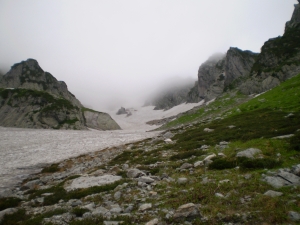 7月25日二日目、地元立山地方の天気予報は深夜から午前9時まで曇り、9時から12時まで晴れ、その後曇りというものであった。午前2時起床、3時05分出発。外は真っ暗で空には黒い雲が広がっていてあの雲が今後どうなるのか気になった。ヘッドランプをつけてまず劒沢の夏道を下り、途中からアイゼンを装着して雪渓に降り立つ。雪渓は五月よりかなり薄くなっているもののアイゼンがよく効く。劒沢雪渓をぐんぐん下って出会いから長次郎谷に入った。ここからはひたすら登りである。風がかなり出てきて、空はどんよりと雲が厚くかなり不気味な天気である。今日の予定は6峰Dフェース登攀であったが、この不安定な天気のため、短いCフェースに変更ということになった。左手に源次郎尾根、右手に八峰の岩峰が迫りどんどん高度をかせいで登る。稜線はガスが巻いて6峰のDフェースから上は霧の中にかすんでいる。 熊の岩と6峰フェース群 ガスでぼやける6峰 熊の岩まで来てとりあえずCフェースの取り付きまでは行こうということで、Cフェースの基部で窪んだ砂地になって安全な取り付き地点まで到着。 6峰Aフェース 6峰B ・Cフェースここでおよそ1時間様子を見た。雨がぱらぱらきたかと思えば晴れたり曇ったりと決め手のない気象状況で迷ったし天気予報の12時まで晴れというのも悩ましかったが、最終的に登ることになった。Cフェースの岩登りそのものは易しく登攀に困難は全くなかった。でも時たまぱらぱら降る雨と風と雲行きが少なからずストレスになった。初心者の私は焦るとできるものもできなくなってしまうので、肝をすえて「焦らない」と言い聞かせて行動した。ガイドと私の1対1のクライミングなので私も登る以外にガイドのビレーとカラビナ類の回収という果たすべき役割があって一瞬もぼんやりできない。登攀中に写真を撮る時間など全くない。その上、今日はスピードも要求される。5ピッチのショートルートだったが天候不安の中で登るというとても貴重な経験をした。 Cフェース終了点にて 八峰 1峰(奥)から5峰(手前) 終了点までは1時間10分余りですぐ着いた。問題はこのあとの5・6のコルへの下降だった。またしても雨がぱらぱら、風も吹く、ものすごくざれて危険で歩きにくい下り、はっきりした踏み跡がないなど~行きはよいよい帰りは怖い~だった。最期に懸垂下降して5・6のコルにたどり着いた時はほっとした。今日出会ったパーティは3組、いずれも岩には取り付かず稜線に向かって登っていった。 結局この日、岩登りをしたのは劒広しと言えども私達だけだったにちがいない。復路は長次郎谷を出会いまで下り、そこから大雪渓を小屋まで登り返した。最期の1時間半位を残す頃になって雨が本格的に降り始めた。天気の悪化が決定的になり、結局翌日予定の八峰縦走を中止して下山したのだった。