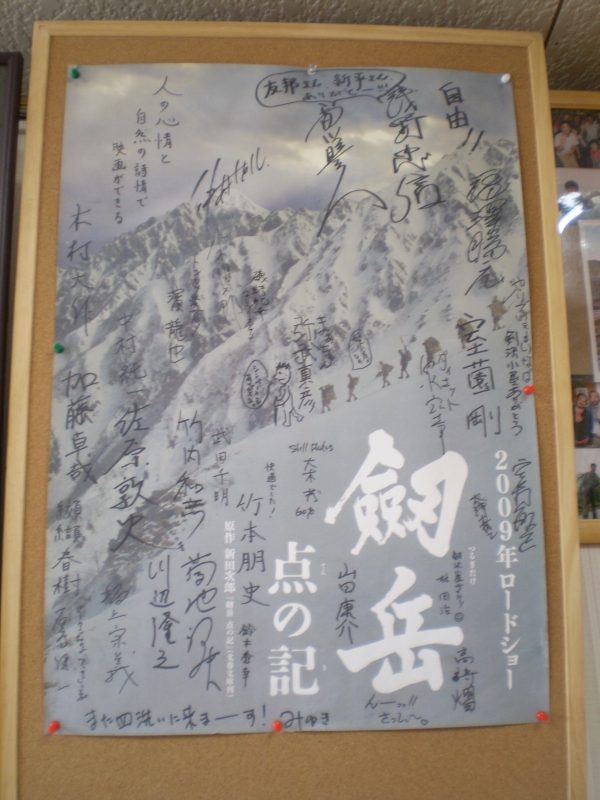 映画「劒岳点の記」が登山をする人たちの間で大変話題になっています。この映画は監督以下スタッフが劒沢小屋(古いほう)に寝泊りして撮影されたものです。浅野忠信さんも香川照之さんも木村監督もです。もちろんその間は一般の登山者も宿泊しています。俳優や撮影隊の皆さんも日時が経つうちにヒゲが延びたり日焼けしたりしてほとんど一般登山者と見分けがつかなかったということです。浅野さんが土間で靴をはいている横で一般登山客が「浅野忠信も来てるんだってね」と話をしていたとも聞きました。完成後にスタッフがポスターに寄せ書きしたものがありましたので大きくしてアップしました。左上に木村大作監督、中央横書きで中村トオルさん、友邦さん(二代目)新平(三代目)ありがとー!!の謝辞の下に浅野忠信さん、香川照之さんのサインがあります。またこの映画の登山面での監修・援助をされた地元山岳ガイド多賀谷さんとは雷鳥坂を登っている時お会いしました。素朴で温かさがにじむ男性でした。帰りにも会いました。