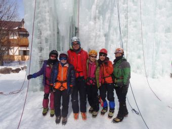 翌2月5日も一日アイスクライミング三昧。明け方に冷え込んだものの日中は陽射しが出て氷瀑は場所によっては柔らかくなっていたが状態は良い。今日も昨日と同じ班でルートを変えながら練習に励んだ。 同じ班の皆さんと 中央は松原ガイド Y さん二日目で皆さん体も慣れてきてあちこちで力いっぱい頑張る若い皆さんやアドバイスと応援の声が行き交って雰囲気が盛り上がっていた。私は頑張らず気楽にやっていたが、基本だけはしっかり身につけたいと思い、適切な足置きができること、利き腕の真下に反対側の足をもってくること、腰を入れて上半身は開くことなどを意識して練習した。できた時もあり、混乱したこともあったが、時たま足のリズムを作ることに成功したルートもあった。 A さん 下を見て良い足場を探す今日はスタッフからぜんざいの振る舞いがあった。小さなお餅に小豆がとてもおいしかった。糖分を要求する疲れた体にぴったりの食べ物である。 イケメンの顔もほころぶおいしいぜんざい つららが伸びる軒下小川山山麓のここ岩根アイスツリー周辺は例年より雪は少ない気がしたが、つららが長く伸び、宿舎脇には室内で使用されているバーモントキャスティングの薪ストーブ用だろう、膨大な量の薪が積まれていた。無意識に薪を積んだのだろうが、石垣に似てとても造形的で面白くFさんとしばし見とれていた。でもこれだけの薪を作り積み重ねるのは相当な労働だろう。山での生活は外で見るほど気楽ではないと感じた。 ストーブ用の薪