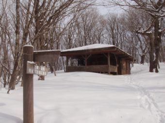 4番目の氷瀑F4を登攀し、終了点を通過して上に向かうと荒船山艫岩展望台に出る。クレヨンしんちゃんの作者が亡くなった現場で、ここから落ちれば確実に死ねるだろうが、200mの大絶壁の下は全く見えないため、飛び込むにはよほどの覚悟が必要だろう。 荒船山艫岩の避難小屋 荒船山頂に続く平らな雪道避難小屋があったので一休みし、ついでに荒船山山頂までハイキングしようということになった。山麓からも一別できる平らで巨大な山容のその平らな部分を延々と歩く。やっと尖った山頂が出てきて一登りで到着。小さな祠があった。ここにも和歌山青眼渡寺の修行札が納められている。 荒船山(経塚山1,422m)山頂 注連縄が張られた小さな祠 この頃から雪がちらちら降りしきるので2:55分山頂を後にする。再び延々と雪道を歩いて艫岩避難小屋に到着。さらに雪の下が凍っている道を飽きるほど歩いてやっと4:55分頃、出発地点の内山峠についたのだった。昇天の氷柱アイスクライミングに荒船山スノーハイクと1日で2種類の山を楽しめて充実の一日になった。
