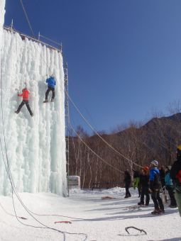 2月4日岩根アイスツリーにアイスクライミングに出かけた。中央線小淵沢から小海線に乗り換え信濃川上で下車。バスで小川山山麓へ入る。久しぶりに会った友人が沢山いて懐かしさ一杯だった。すっかり嬉しくなってみんなと近況報告に花が咲いた。天気もよくて無風、氷瀑は固く締まってコンディションは上々だった。17名くらいの参加者を3班に分けてそれぞれガイドがついて指導を受けながら練習した。私は同世代の熟年女性5名のグループだった。 参加者で賑わう岩根アイスツリー私は熱中すると年も体も忘れて頑張り、後で肩や背中の痛みに苦しむので、今回はほどほど7分程度にしておこうと固く心に決めていた。初日なのでのんびりゆったり昇って肩を慣らした。指導された通りにはなかなか出来なかったがそれでも少しづつ体が動くようになった。 アックスの真下に反対側の足 久しぶりに会った岳友 Kさんと アイスクライミングの主要ギアは二種類。両手に持って氷に打ち込むアイスアックスと足で蹴り込むアイスクライミング専用のアイゼンである。私は1本爪アイゼンは持っているがアックスはレンタルしている。一流メーカーの何種類ものアックスが集まり、重さや使い勝手、デザインもそれぞれで特徴があってなかなか面白かった。その中でも最新のクォーークは軽く鋭く素晴らしいギアだった。 標準的仕様 黒龍をイメージするデザイン 最新のクォーク午後2時半を過ぎると少し風も出て段々寒くなってきた。協賛会社のスタッフからお汁粉の振る舞いがあり、とっても甘く美味しく温かく、感謝した。 お汁粉を作るスタッフ夜は懇親会があった。気のあった友人や初対面の人たちが一緒に寛ぎ、ジャンケン大会で盛り上がり、穏やかな夜が更けていった。自宅から離れて上げ膳据え膳で家事から開放され、母でもなく妻でもない自分自身でいられることに最高の解放感を感じる。