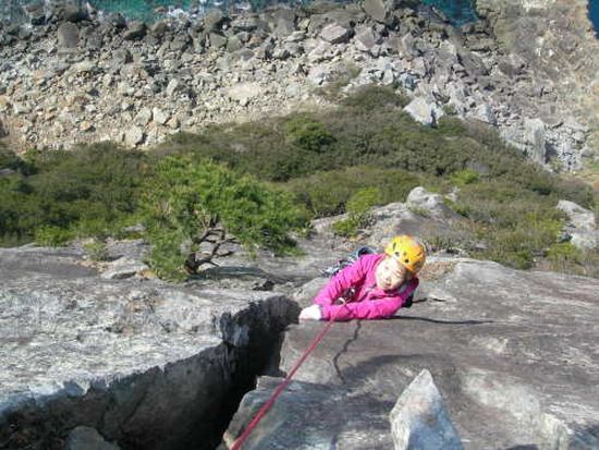 眼下には青い海が広がる海金剛スーパーレイン2月28日、西伊豆波勝崎の海から立ち上がる岸壁・海金剛のスーパーレインを登攀した。ここはけっこうやりがいがあるルートだった。まず海を右手に見ながら崖やガレの山道を1時間ほどトラバース、草つきの断崖を懸垂下降し、ブッシュの中の取り付きに到着。装備を確認して8:45分スタートする。天気はまずまず、温かかくはないが、風もあまりないので耐えられる。 断崖を懸垂下降して海辺へ降りる 凹角の第1ピッチ 第2のピッチスーパーレインは全7ピッチのクラック中心のルートである。1ピッチ目はブッシュの凹角から始まる。その後少し徒歩でブッシュを登り2ピッチ目。核心は3ピッチ、4ピッチ、5ピッチできれいなクラックが続出、その攻略に知恵を絞った。手が届かなくて苦労した部分もあったがとても面白く登りがいがあった。 5ピッチ目 上部尖った岩が終了点 岸壁と広がる伊豆の海少し緊張したのは7ピッチめの出だしである。どうやってあのワイドクラックに乗り移ろうかと真剣に考えた。しかし案ずるより産むが安し、どうにか乗り移れて上のガバをとったら後は楽だった。 最終ピッチのワイドクラック 足が短い私にできるかしら?この所岩に触ってなかった私は登れるかどうかとても不安だったから終了点に到着した時はとても嬉しかった。伊豆の穏やかな海と波勝崎の奇勝が広がっていた。解放された。 波勝崎の海 反対側の烏帽子岩 山頂にて同行のMさんと足元に広がる海を楽しんだ後は4回の懸垂下降で海辺に降りる。これが予想以上に手間取った。ブッシュだらけなのであちこちの潅木にロープがひっかかったりして焦った。途中空中懸垂もあったりして楽しめた。 懸垂下降するMさん