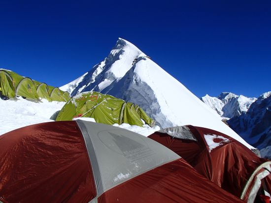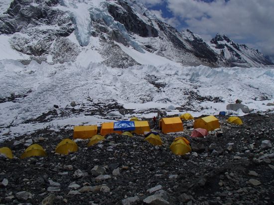 私たちのベースキャンプの概要を紹介します。 まず、共有施設です。中央の大きい四角いテント、左から食料保管庫1棟 3棟連結してシェルパテント・キッチンテント、濃いオレンジ色のダイニングテント、少し離れてトイレテントとなります。共用テントの手前(モレーン側)に並んでいる楕円形で黄色いテントが私たちゲストの個人テント、それ以外の氷河側に点在しているのはシェルパやキッチンボーイ達の個人テントです。 キッチンテントの中 ダイニングテントの中 電気はパネルから調達 マイテント 食料保管庫 トイレテントちなみにマイテントはなかなか広く、荷物も十分に置けました。ダイニングテントも快適でガスストーブもあり、寒い夜は赤く燃えるストーブの熱に助けられました。また電気はソーラーパネルから調達するので、天気が良かった日はカメラ、携帯、PC、アイ・ポッドなどの充電ができました。