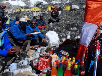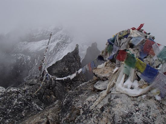 エベレストBCに着いて数日後、登山の成功と安全を願う儀式プジャが行われました。朝からシェルパの皆さんが大勢集まって綱を張ったりお供え物を運んだりしてお祈りのシンボルになる小さな塔を造りました。お酒やお菓子などお供え物をたくさん備えられてちょっとしたお祭り気分です。 たくさんのお供え物が備えられ、私たちのピッケル・アイゼンも安全祈願のために備えました。 本来なら僧侶が祈祷文を読むところですが、本日はサーダーのプルバ・タシが中心となって全く意味は分からないけど有難いお経を1時間ほど唱えました。プジャの終わりには、ツァンパ(ハダカオオムギの粉 チベットの伝統食)を顔と右肩に塗って、登山の安全を願いました。 5色のタルチョーはためく下でインドネシアの3人。それにしても空が蒼さが際立っている。