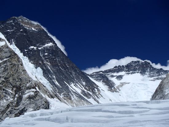 氷河トレーニングの数日後、ロプツエイースト(6119m)に高度馴化登山に出かけました。6000m台の雪山でフィックスロープが張られた本格的登山になります。まずエベレストBCから一日かけてロプチェBCまでトレッキング。私たち倉岡隊のロプツエBCはラッセル隊のBCよりずっと上の方にあり、遠い。こじんまりしたBCが設営されていた。翌日C1(5300m)まで登る予定だったが、C1で宿泊せず一気にピークまで登ることに変更。登頂日は早朝の出発。すばらしい晴天で眺望は完璧だった。本日の写真はすべて倉岡隊長から頂いたものです。 スタートしてしばらくするともう岩の急登、毎日練習したカラビナワークが試されます。何回か岩場を乗り越えてやっとC1に到着。ちょっと荒涼とした平らな岩が広がっています。 C1ここで一休みして更に登ります。この辺りからは岩と雪のミックスになり、アイゼンを装着。 道は益々急勾配、雪も増えてピッケルにユマールを使って登るがなかなか苦しく、真剣に1歩1歩登る。手が短いためぴったり合わない手袋でユマーリングするのがやはり順調にいかず隊長のサポートの指導の下、一生懸命でした。C1に泊まらずBCからダイレクトに登るのはやはり厳しくどこまで登ればピークなのと思いつつ頑張って雪の急斜面をフィックスロープ添いに登ってやっと肩に到着。テントの中に座った時はしばし陶然かつ呆然としていました。落ち着いて外に出て見ると360度の大展望が待っていました。 ロプツエピーク肩よりエベレスト方面を見る ALL Photo by H.Kuraoka