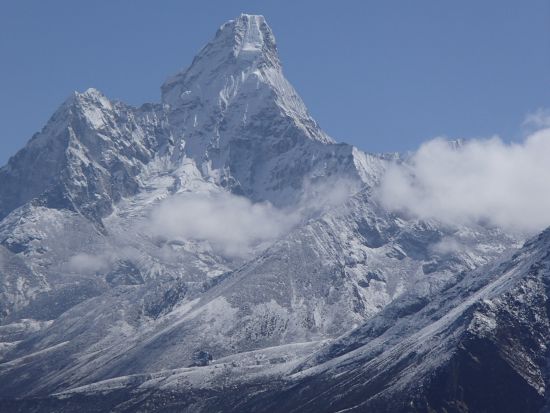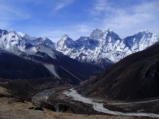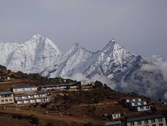 ここまで歩いて来て追に一度見たら忘れられない特徴ある山容をしたアマダブラムが姿を見せる。やはりエベレスト街道と言えばこの山です。カンテガも丸い帽子を被ったような姿をさりげなく見せます。 アマダブラム(母の首飾り)6812m カンテガ (6685m ) クムジュン村の守護神 圧倒的なタムセルク(6623m) 逆方向には 聖山クンビラ(5761m)