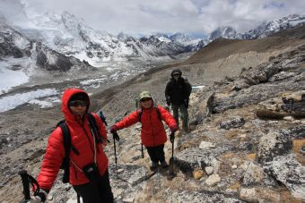 4340mのディンボツェで3泊した後はまたトレッキングを続け、途中のツォクラ(4590m)は水が悪くて必ず下痢になるので休憩もせずパスして、4930mのロプツェまで歩きました。この辺りからはタウツェなどこれまでと違った山々が姿を現し、天気もよかったので大迫力の山岳風景を堪能しました。これぞヒマラヤという感じでした。 巨大な山を見上げながら一休み 人が小さい!! 石造りの素朴なカルカ こういうものに惹かれます Himexs(ラッセル・プライスの会社)隊のロプツェBC テントがきれいです途中、丘の上にたくさんの慰霊碑が集められている場所を通りました。 生涯一ヒマラヤニスト 丸山芳雄慰霊の碑 2005年建立 秋田海外登山隊有志一同 と読めました。ちょっと胸に来るものがありました。 ロプツェのロッジ 嬉しそうに女性と話すシェルパのラムさんここまで来るとこれまでのようなチョルテン、マニ車、マニ石、お寺等は見当たりません。もう常住して生活する場ではないのでしょう。ロッジの周辺も殺風景です。ロッジの中に欧米系の女性で胸元を広く開けた魅力的な女性がいて、私とVickyはこの寒い中でよくあんなに胸元を出していられると驚き、男性は喜び、ちょっとしたトピックでした。