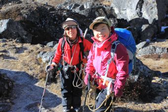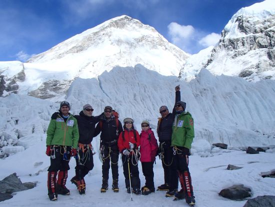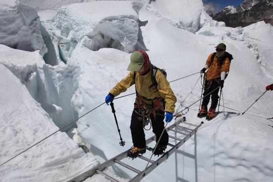 アイスフォールの状態が少しましになったという情報の元、アイスフォールの下見とトレーニングに全員で出かけました。BCから見るとあのアイスフォールのどこに登れるルートがあるのだろうととても不安ですが、実際に現場に着くと斜面にトレースが見えました。出始めは雪だけですが、傾斜が急になるあたりからすぐフィックスロープが出てきて、まずカラビナワーク、次はクレバスに渡されたジュラルミンのはしごの登場、その次がユマーリングが必要な厳しい登りになりました。 はしごの下は何十メートルというクレバスが切れ落ちていて、それがイヤでも目に入ってしまいます。足が小さいので梯子の横棒の真ん中に靴が来るように位置を決めなければなりません。ものすごく緊張してアイゼンの歯をギシギシ言わせながら梯子を1歩1歩渡っていきます。靴とロープを掴む手のバランスの取り方にコツがあり、安心して一歩踏み出すまでに慎重にロープの張り方や姿勢を工夫しました。 2連の梯子を渡る トレーニングを終えてほっと一息です (All Photo by K.Kuraoka)