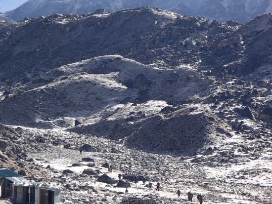 ベースキャンプ(5350m)に到着してしばらくは5000m台の高度に慣れなくて、顔がむくんだり息苦しかったりしました。5日目辺りに近くのプモリC1に馴化に行きました。プモリはBCの背後に重々しくそびえている三角錐の山ですが、取り付きは少し戻ったモレーンの土手のような場所から急坂を登ります。 中腹から更に高度をあげてやっとC1へ到着。テントを設営したと思われる平らな跡がいくつかありました。少し高度が上がっただけで見る景色は大違い!!BCを俯瞰できたし、荒々しいプモリの氷河を真近に見ました。 上から見るBC プモリの氷河