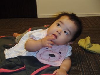 娘夫婦が転居することになり、その手伝いに行った。手伝いと言っても私の役目は娘夫婦が引越しのあれやこれやの作業をしている間、孫の葵ちゃんと遊ぶという気楽なもの。葵ちゃんは先日も会ってるし、私とは相性がよくて全くむずかったりしないので私もストレスにならない。今日も二人で玉ころがしに興じた。お座りはとても安定しているがハイハイをしない。少し手を出してハイハイができるような足の形にしてやるとハイハイができると思ったのも柄の間、何と前進しないでバックしている!!どうも腹ばいが嫌いらしい。太ってお腹が飛び出しているからか? 最近は男の子のような顔になって何でも口に入れるが、娘夫婦も神経質に注意せず機嫌の良いままにさせているので、この子はしごくおっとりしている。離乳食よりもまだママのおっぱいが好きだ。