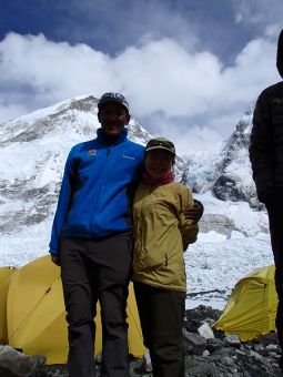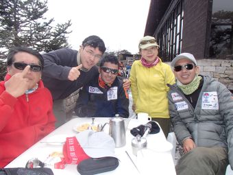 標高5350mのエヴェレストBCにおよそ1ヶ月ステイしました。その間に有名・無名の方たち何人もの人との出会いがありました。懐かしく振り返ってみました。 エベレスト登頂21回のシェルパ プルバ・タシとヒマラヤン・エクスペリエンス(Himex)の最強ガイドエイドリアンです。みんな身長が高くというより自分が短く小さく、この身長差!エイドリアンは細身でハンサム、ガイドというより男性ファッション雑誌から抜け出してきたようなかっこよさでした。 Himex社長 ラッセル・プライス氏と 同 ガイド Shinjiさんです。ラッセル・プライスさんも身長高く恰幅も良く圧倒される巨大さでした。座ったラッセルと立ってる私がたいして変わらない。Shinjiさんは日本人で何時もはスイスにお住まいで、とても素敵な紳士でした。みんなブルーのジャケットを着てますが、これはHimex隊の制服です。 最後は石川直樹くんです。倉岡隊長に挨拶に見えました。日本から持参したおいしい羊羹をみんなに頂きました。なかなか礼儀正しく物静かな好青年でした。昨年はエベレストに登頂、今年は隣のローツェ登頂の計画でしたが、ラッセルが5月6日に総撤退を決断したので名残惜しそうに下山されました。隊長もカズも「ちょっと世界のてっぺんまで」という彼の本にサインしてもらってました。本を持って来なかった私は地図にサインしてもらいました。