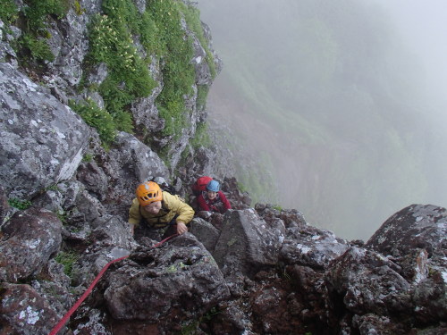 平山郁男シルクロード美術館で心を清め、再び小海線に乗り小淵沢に出た。車で美濃戸から入山、午後4時頃赤岳鉱泉に到着。何とお風呂があって汗を流すことができ、さっぱりした。夜は7時就寝、早朝3時起床。しかし夜半に驟雨があり、どこも濡れているためしばらく様子待ちし、5時頃出発した。大同心稜の急坂を黙々と昇りつめ、大同心雲稜ルートの基部まで着いた。しかし雨のせいで岩も草も濡れていてこのコンディションではリスクが高いとの判断で、結局大同心は諦め、小同心クラックを昇ることになった。 小同心クラックを昇る私とMさん小同心クラックは3ピッチ、やさしいのでクライミングシューズに履き替えずアプローチシューズのままで昇った。岩はホールドが豊富にあり、楽しく昇ってすぐに終了点に着いた。横岳のギザギザの稜線を縦走する登山者の姿を見ながら、横岳山頂まで岩場を直登した。岩キキョウ、麝香草、ちょうのすけ草、ウルップ草、深山大根草、おだまきなどたくさんの高山植物が咲き乱れていた。一般ルートでないから踏みつけられることもなく、清らかだった。稜線は天気もよくカラリとして赤岳、阿弥陀岳、硫黄岳など南八ヶ岳の峰峰がくっきりと見え、気持ちが良かった。下山は大同心稜を降りた。ザレ場のあちこちに駒草がたくさん咲いていて可憐だった。