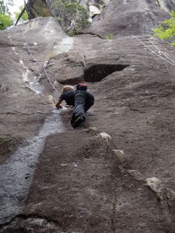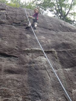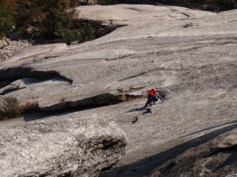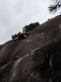 7月21日、22日と小川山にクライミングに行った。降ったり止んだりの不安定な天気だったが、一日、外岩でクライミングできてよかった。まず、マガスラブに行って1,2本昇った所で雨が降ってきて、急遽撤収して下山。下まで降りて着たところで空が明るく見える。じゃ、ちょっと近くの左岸スラブに行って昼食食べながら様子を見ましょうということになって3年振りに左岸スラブへ。その後ぱらぱらお湿りもあったが中止するほどでもなくて、あのドスラブを登れて良かった。 白くツルツル見えるドスラブ ジャーマンスープレックスの核心部私は左岸スラブのブラックアンドホワイト(5.10a)ジャーマンスープレックス(5.10b)を見ると昇る前から脅威を感じる。身長のない私にとってはスラブはリーチ差による不利が少ないので好きな分野なのだが、この二つのルートは手強い。手も足も安心して置けるホールドは殆ど無い。ほんの1センチ位の穴とか窪みに手を置き、種子骨症で痛い足親指に力を入れて立ちこむのだが、落ちそうな気がする。「落ちない」と自分に言い聞かせ、「落ちないで」と祈りつつじりじりと体を上げていく。結構M的行動だ。 ブラックアンドホワイト トムと一緒