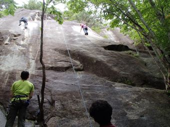 7月8日午後4時半過ぎ、小川山でのクライミングが終了して小海線信濃川上駅の待合室で電車を待っていた。私達の他にもう一グループクライマーらしき人達がいた。何気なくそちらに視線をやって目が点になった。開きにくくなっている瞼をしっかり見開いてなおも凝視すると、それは確かにKさんだった。Kさんも私を認め、お互いに近づいて抱き合った。「わあ、こんな所で会えるなんて、嬉しい!!」興奮して周囲の迷惑も考えず歓声をあげ、近況報告をしあった。彼女もクライミングに行っての帰りだったのだ。私達は昨年10月韓国のインスボンにクライミングに出かけて知り合った。すっかり意気投合して「ここで知り合えたことが最大の収穫」とお互いに言い合うほど楽しく有意義な5日を過ごした。 インスボン シュイナードBをクライミングするKさん 山頂にて Kさんは高知県在住で高度な専門職につきながら、首都圏に住む私達と全く同じように小川山のクライミングに参加するスーパーウーマンである。海外登山も数知れず。今後の山行計画をあれこれ話しながら又の再会を期して別れたのだった。