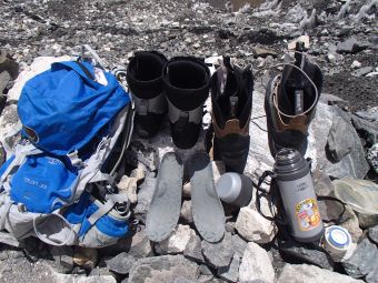 私はBCに下山し、本隊はその後、C3まで登りそこで1泊して、BCに戻ってきた。C3の登りはものすごく大変だった、C3のテントは不安定な地形の上に設営されていて眠る状況ではなかったとのことだった。戻ってきた隊長は早速私のテントに来て告げた。「C2でのあの状況は脳浮腫だと思うんだよ」脳浮腫!!聞いて絶句した。脳浮腫と言えば肺水腫と並ぶ高山病が最悪に進行した末期症状ではないか。私がそんなことになっている??これまで高度馴化は順調で頭痛、吐き気、下痢などほとんどなかったし、咳も出たことはなかった。その時も頭痛、吐き気、運動障害など脳浮腫につながる体の症状は特に感じていなかった。「疲れたのは確かですけど、脳浮腫の自覚症状は全くないんですけど?」「本人は自覚がなくて見ている周囲がおかしいと感じるんだ」と隊長は言った。しかしあれが脳浮腫だと言われても納得できなかった。でも隊長はエベレスト登頂5回、チョー・オユーやマナスルにも登頂している高所登山のエキスパートである。その人の判断である。素人の私はそれ以上反論できなかった。すぐに携帯メールで日本の息子に高地脳浮腫についてNETで調べて情報を送ってくれるよう頼んだ。返信はすぐ来た。脳浮腫に陥った時の体の状態や、脳浮腫になるとまっすぐ歩けなくなるのでその運動能力診断法などが有益だった。しかしそれにもほとんど当てはまらない。中でも頭痛や吐き気、めまいなど身体反応がほとんどない。自分が脳浮腫だということが信じられなかった。こういう場合の確たる診断方法はないのか?焦った。 天気の良い日には登山用品も日光浴 乾燥でひび割れた指先おおいに困惑しつつ、BCで数日間のんびりした。確かに疲れていて・・というより高所に長くステイして体力が衰退してきたという感じだった。20歳代の若い男性群はみんな平気のように見えた。