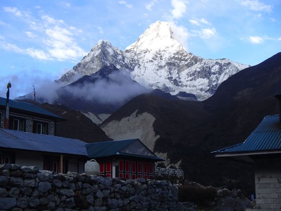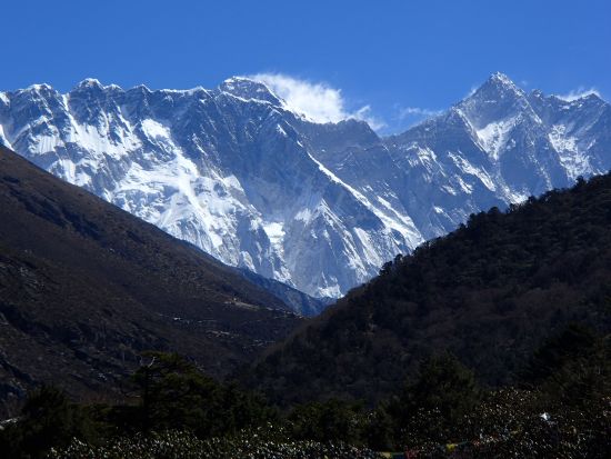 下山2日目はパンボツェ(3960m)→タンボツェ→ブンキタンガ→キャンジュマ→ナムツェバザール(3450m)というルートを歩いた。行きに通ったシャンボツェやクムジュンは通らない。距離的には1日目より短いし、高度も500mほど下がるだけなのだが、これがまたしんどかった。傾斜のある登り降りが激しくて消耗した。熱こそ出ないが呼吸器周りは昨日と変わらない状態で喉の痛みは益々酷く、咳と痰で悩まされた。絶景が続いていたが、今ひとつ心から楽しむ余裕はなかった。今回はタンボツェ僧院経由だった。そこから遥かかなたにエベレストが見えた。小さくなったエベレストを見て心から悲しくなった。この間は目の前に黒く巨大にそびえていたエベレストがあんなに遠くなっている。ああ、私は登りたかったあの山に登れないで、もう登山の圏外に下山してしまったのだと思うと、心から悲しさがこみ上げてきた。 タンボツェ僧院前から見る遥かなエベレスト思い出あるタンボツェ僧院だったが、ろくに休む暇もなくベーカリーによる余裕もなく更に下った。タンボツェからナムツェは「こんなに遠かったっけ?」と思うほど遠かった。シェルパのMは新婚ほやほやだと聞いていた。その妻が何とナムツェまでまだかなりある距離がある地点に食べ物と飲み物を携えて夫を迎えに来ていたのには仰天した。このMというシェルパは不親切で、これまでも私がどんなに咳こんでも「Are you ok?」の一言もないヤツだったが、夫が夫なら妻も妻、それ以後、二人だけでネパール語で楽しそうに喋り続け、私は彼らから離れて歩いた。 今日も悲しいほど空が美しい タンボチェ僧院 新婚のM夫妻登っても下っても曲がってもなかなか着かなかった。やっとのことでナムツェのロッジに着いたと思ったらMは明日の出発の時間確認もしないで、すぐに妻とナムツェの街に遊びに出かけた。とんでもないシェルパだった。彼は親切で忠実というシェルパのイメージを完璧に覆したのだった。その夜はこのロッジで連泊しようかと思うほど疲れていた。帰りにここで仮面を買う予定で行きに下見したおいたのに、街にでる元気もなくベッドに横たわったままだったが、一晩中咳であまり眠れなかった。