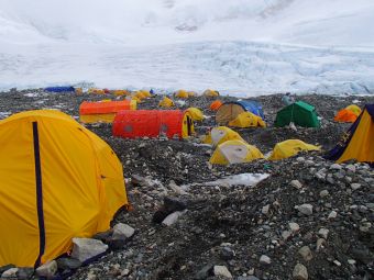 バラ色に輝くエベレストとローツェの頂き、まさに神々の山嶺だ。 ローツェフェイスにタッチしてC2に戻ってきたらとても疲れていた。自ずとおしゃべりもしないで静かにしていた。 それが何につながったか?そんな静かな私を見て隊長は普通ではないと判断した。静かなのがとても気になるとも言った。疲労と低酸素で思考能力を失い、異常事態になっているのではないかと。 テント脇にたくさん積まれている酸素ボンベ 小さなソーラーパネル隊長は更に言った。この標高6500mというC2にいては体力が衰退することはあっても回復する見込みは全く無く悪化するばかりだから、BCへ下山したほうがよいと。 C2のテントの中 モレーンの上に石のテーブル C2の夜BCに下山せよと言う隊長の発言には大変戸惑った。そんな事態になっているのか?しかし私も疲れている自覚はあったので、皆と行動をともにできない残念さはあったものの、BCに降りて体力を回復させることには異論はなかった。ここで下山してもアタックのチャンスはあると隊長は言ったし、自分もそう考えていた。そのつもりで高所服や食料などアタックに必要な物はテントにデポしておいた。翌日、シェルパ一人を伴ってウエスタンクウムからC1へ、さらにアイスフォールを下ってBCへ帰還した。アイスフォールの降りはカラビナワークだけでユマリングは無かったので楽に下れた。BC近くまで降りると最も信頼できるシェルパのラムさんが飲み物を携えて出迎えに来てくれていた。嬉しかった。