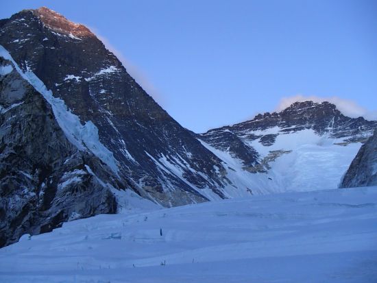 C2(6450m)に着いた1日目は高所服を着ていても寒くて夜はあまり眠れなかった。BCに着いてからずっとナルゲンボトルにお湯を入れてもらってそれを足元に置いて湯たんぽにしていたが、それがここでの唯一の暖房だった。1日ステイしてやっと夜眠れるように慣れた。翌日はC3に登る足慣らしと高度馴化でローツェフェース(6850m)まで登った。雪が舞うとても寒い日で標高そのものはそんなに上がらないにもかかわらず疲労感が体を襲った。ローツェフェースは荒々しい山肌を見せて迫り、ここの一体どこを登るの?という迫力で迫ってきた。 C2に立つテント群 一休みする男性陣 結論的に言うと今回の遠征でたどりついた最高地点はこのローツェフェースだった。これからが本番のアタックなのだが、ここに来るまでも決して楽なものではなかった。ローツェフェースにタッチしてC2へ下山した。