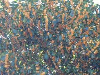 10月半ばから金木犀があちこちにオレンジ色の花をつけて、そのいい香りが漂ってくる。ウォーキングのルートを歩く時にも,家々の角から公園の中から花のある場所はわからなくても、その香りが存在を示してくれる。わが家の金木犀も見事に花をつけ、毎日芳香を放って楽しませてくれている。植えて24年になる金木犀は枝を四方八方に大きくのばして、お隣の屋根の上まで進入している。花と香りの時期はいいのだが、それを過ぎるとお隣に迷惑をかけていることが後ろめたい。自分で簡単に伐採もできないため、いつも気にしながらもそのままでこれまで過ごしてきた。そろそろ潮時かな。