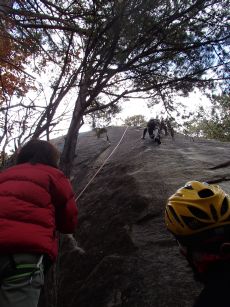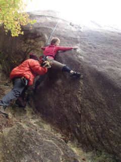 翌日14日もそこそこの晴天に恵まれ、朝一で水晶スラブに出かけた。ここは易しいルートが無くてアップから5.10aのツイストから開始する。スラブはリーチの影響が比較的少ないので私はけっこう好きである。クラック状の無名ルート、チムニー状の無名ルートを楽しんだ後、あばたもえくぼ(10.c)、ノイズ(5.11a)と真面目に取り組んだ。ノイズは斜めに右上する真っ白いダイクが特徴のルートだが、地上から岩に上がる箇所が私のようにリーチのない小人族には離陸できない。今日も後ろからお尻を支えてもらってやっと離陸できた。離陸するまでに一苦労、離陸したら更に苦労する難しいルートだが何とかクリアできてほっとした。 ノイズ 手も足もツンツンでまず離陸 後半も難しいランチの後は身の程知らずだがやじろべえ(5.11b)にチャレンジ。前半の核心は垂直でつるつる、やや湿っぽい岩肌のスラブから中間にあるフレークまで。アドバイス通りに体を使えて何とかフレークを掴む。その後もはるか左横上のポケットを取るためにムーブを工夫、後半は何にもホールドらしきものがない本当の核心をじわじわと攻めて何とかトップアウトできた。とっても嬉しかった。忘れないうちにと2回昇り、少し自分のものになった気がした。このところ昇れない自分をいつも感じていたので、今日は自分も昇れそうという気持ちを取り戻せて良かった。
