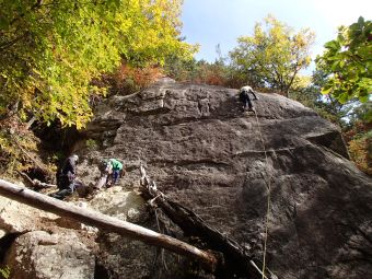 10月13日小川山に行くため新宿発7時のスーパーあずさ1号に乗った。晴天が続く予報もあってか登山者ですごい混雑、新宿ですでに通路まで人でいっぱいだった。私は6時25分頃にホームに行ったが、既に10人くらいの人が先頭に並んでいた。でもどうにか座れて韮崎まで行った。本日の参加者は6名、ソラマメスラブに繰り出した。黄葉に青い空、乾いた白い岩が映えてクライミング日よりだった。まず下部スラブで生木が倒れたよ(5.9)、三色スミレ(5.10a)、甘食(5,10b)と昇った。久し振りなので初めのうちはとても体が硬く、ルートを忘れていたりしたので2回ずつ昇った。甘食を昇り切った頃にはやっと体も岩になじんできた。その後、上のドスラブに移動し、ソラマメスラブ(5.9)、ロングロングアゴー(5.10b)、ソラマメハング(5.10d)と昇った。ソラマメスラブの核心部でリーチが無いためこれまでいつも非常に苦労して力を浪費する箇所があったのだが、今日は先生の一言でうまく体を使えてこのルート開始以来の楽な動きで上に抜けることが出来、歓喜した。ソラマメハングはムーブを間違えて抜き差しならない宙ぶらりんになってしまい、敗退。練習してないから仕方がないと酷く疲れない前に潔く降参した。 ソラマメ下部スラブ ソラマメスラブ