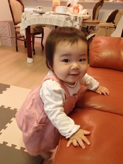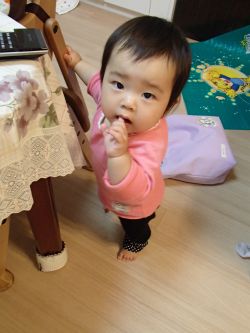 10月18日初めて葵を保育所に預けに行った。娘の出勤時間が葵を預ける時間より早いためである。自分も3人の子どもを保育所に預けてお世話になり、送り迎えの生活を12年間送ってきた。私の場合、核家族で手助けをしてもらえる人が皆無、夫は早朝出勤で帰宅も遅く全く当てにできなかった。子育てと仕事に追われる忙しい毎日で日々、戦争のようで、夜の12時になってもまだおむつを洗濯していた。良くないことだけど「早く」が口癖になっていた。それに比べれば今はずっと楽だ。子育て支援制度そのものが大幅改善されているし、社会全体の理解が進み、イクメンは当たり前になっている。娘の夫も育児には協力的だし、おばあちゃんとして私もサポートしている。これが肉体的・精神的に大きいと思う。娘が出勤した後、ゆっくり朝食を食べさせ、可愛い服を着せ、前おんぶで保育所に連れていった。別れ際に泣きもせず、ご機嫌で保育所の仲間のほうに行く葵ちゃんだった。 ピンクのジャンスカで女の子みたい ワタチ、こういうものが大好きなの