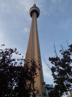 カナダ最後の夜はトロントの名物CNタワーで夜景を楽しみながらディナーとなった。CNタワーなんて全くしらなかったが、何でも日本のスカイツリー(634m)、中国の広州塔に次ぐ世界第3位の高さ(553.33m)をほこるタワーだという。確かに高い。首を垂直にあげなければ先端まで見えない。形はスカイツリーに似ている。というより高層建築塔の必然的デザインなのだろう。 CNタワー 夕方5時頃 ライトアップたくさんの観光客に混じってエレベーターで展望台まで上がった。すばらしい夜景だった。 この展望レストラン360は70分ほどかけて一周する。カナダ人仕様の豪華だが私には多すぎる食事を残すことができず、また肥った。 夜景と食事を楽しむ 怖かったガラスの間帰りにガラスの間という所に行った。床にガラスが張られていて500メートル下が一直線に見える。怖かった。このガラスは強いから絶対割れたりはしないと頭ではわかって居るのだが、実際に下を見ると不安な気分に襲われた。若い青年がその上でダンスをしたり飛んだり跳ねたりしていた。