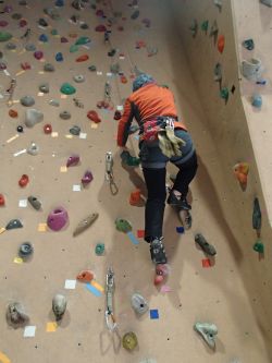 翌日28日(日)の川上村による天気予報は朝から傘マーク、起床時には降ってなかったが外岩は諦めて朝からオンサイトに入り、室内ジムでの練習になった。最初はフリークライミングの練習でショートルートから垂壁をいくつか昇った。三つ峠は人工登攀の練習が必須の場所なので、三つ峠に行けなかった分を取り戻すかのように人工登攀の練習もした。私は数年前に瑞牆山(みずがきやま)大ヤスリ岩でアブミを落として以来、人工登攀がトラウマになっている。しかしこれをマスターしないと行きたい岩には行けないので覚悟して何度も練習した。身長がないので、アブミの最上段まで乗り上がって巻き込みしないと次のヌンチャクに手が届かない、最上段に乗り上がるのはかなりバランスが悪い。しかしやるしかない!!少しづつ手順と巻き込みの要領がのみこめて最後あたりには少しスムーズにできるようになって嬉しかった。 フリークライミング アブミで人工登攀