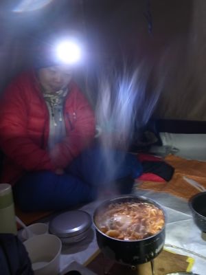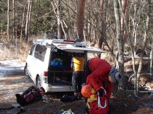 1月28日天気の都合で1日遅らせて、南アルプス大武川(おおむかわ)一の沢大滝めざして出発した。今回は特別に穂高岳山荘の小屋番で映像作家として活躍されている宮田八郎さんと同行する栄誉に恵まれた。初日の今日は小渕沢から篠沢橋先のゲートまで車で入り、そこからテント場めざして雪道を登る。実はこのテント場までのアプローチが私にとっては最大の難関だった。これまでは沢沿いの道を渡渉しながら6時間ほど登ると聞いていた。登るだけなら頑張れるがそれがラッセルだったらもうイヤだ。戸台のラッセルがトラウマになっていた。しかし今回は1393mピークの尾根筋を登るあたらしいルートで既にトレースがあり、ラッセルは無く、普通の雪道だったので超嬉しかった!!篠沢橋前から雪道を少し歩くと直ぐに川にぶつかりそこを渡渉する。水量が多いのでゴミ袋を足に巻いて渡る。近くの尾根に入り、登ること2時間余で難なくテント場に到着。第一関門無事通過。 準備していざ出発 渡渉する宮田八郎さん 森の中で休憩1393mピークの稜線に着くと谷を挟んだ反対側に一の沢大滝が見えた。まるで龍が踊っているような長大な氷瀑で思わず興奮した。すごい、かっこいい!!これを見たら昇らずにはいられない。血沸き肉躍るとはこのことだ。 一の沢大滝の勇姿(左・・私のぼけた写真、右・・宮田さんの鮮明な写真)テント泊の大荷物背負って沢まで下り、また登り返すのは大変なので尾根で風の通り道になっていない斜面にテントを張った。屈強な男性二人が主に地固めや設営をして下さり、私は雪を踏んでいただけだった!。 地固め 3人用のテント 夕食3時頃から温かい飲物を思い思いに飲み、その後はおもしろく楽しいさまざまな話題で盛り上がった。夕食も4時頃で5時半にはシュラフに入った。私用に雪をかいてトイレ場を作って下さり(斜面を転げ落ちるといけないので)、真っ正面にくっきりと聳える八ヶ岳を見ながらトイレができる幸せに巡り会ったし、夜は小淵沢の街の灯が赤く見えて山にいる幸せを味わったのだった。しかし雪の上に寝るのは寒かった。 夕暮れの八ヶ岳