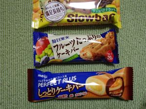 冬の行動食に何を持っていくかはけっこう考えさせられる。寒いためおむすびなどご飯物は凍って食べられなくなるので御法度。これまでは氷点下でも凍らないアンパンやどら焼きを持参していた。しかし雪山が続くと多少飽きてくる。それにアンパンもどら焼きも優良食品だけど、重い。もうちょっと軽くちょこっと食べられて腹持ちのよい物は無いかと思っていたので、新しく3種類のバーを買った。 カロリーはフルーツケーキバーが152KCAL,それ以外の物はほぼ180KCALとハイカロリーだ。それに10種類のビタミン、三分の一日分のカルシュームに鉄、食物繊維3グラムなど栄養が付加されている。平地でたべる分には何の問題もないが、分厚いグローブをした不自由な手を使い、顔も凍る山の上でどんな食感になっているかが問題だ。とにかく試してみよう。