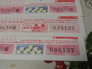 1月も末になり、新年気分も抜けきった所でお年玉が当たってないか年賀状をチェックしてみた。すると3等が3枚当たっていた。頂いた年賀状が毎年250枚くらいで当たるのもほぼ決まっていて3枚。妥当な確率だろう。早速、郵便局で引き換えてきた。めでたい鶴亀をバックに可愛い羊が配置された82円と52円の切手セットが3枚。年を持ち越すと使いにくいので最初にこの切手を使ってしまおう。