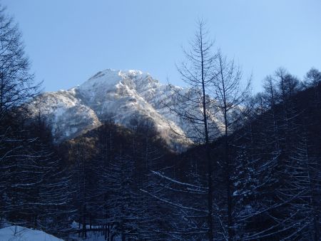 1月9日、マイナス16度くらいの痛烈な冷え込みの中、河原沢左股のマルチめざして朝5時半出発。舟山十字路ゲートから登山道に入りチェーンアイゼンで雪道を1時間半登る。二股でアイスアイゼンとハーネスを着け、更に昇る。最初はまだトレースが残っていたがその内またしても深い雪のラッセルになり、思うように進めなくなった。段差がある部分で腿が上がらない。落とし穴に落ちると出るのに時間がかかる。途中で「雪が多かったので氷瀑そのものは小さく貧弱になっている。そんな滝が4つくらい続くがその間はトレースのない雪道を登って滝を繋いでいくことになるがどうするか」と問われ、氷瀑につけばラッセルは終わりと考えていた私は滝は貧弱、ラッセルは続くという現実に意義を見いだせず、転戦を選ぶ。ここまで登ってもったいないけどもうラッセルはうんざりだった。登った道を再び下って美濃戸の滝に行った。途中振り向くと阿弥陀岳が素晴らしく輝いていた。 美濃戸の滝は沢を渡った上にあり、完全な日陰だった。左右二つの氷瀑があり、小さくて見た目より結氷状態もイマイチだったがこの時間から転戦できる氷瀑がないから止むを得ない。 考えられるすべてのルート6本を昇って早く終了した。
