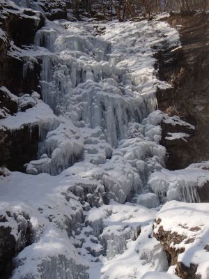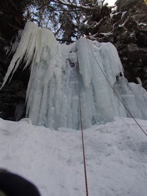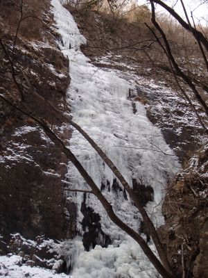 前日に山梨から長野県に大移動して松本周辺に宿泊。翌日1月20日は更に群馬県に移動して犬殺し・子犬殺しの滝を昇った。車で入れる所まで入って後は雪道を登る。けっこう雪が深い。でもラッセルではないので黙々と登るだけ。二つの滝は隣り合って並び立ち、なかなか立派だった。子犬の方は緩斜面で段々になっているので取っつき安そうにみえたが、犬殺しのほうはバーチカルで先は見えない長さ、これ、私に昇れるかしらと多少の不安がよぎる。更に上州の空っ風と低温でビレイ中はダウンを着ても下半身はがたがた震えていた。 子犬殺しの滝子犬殺しは楽に楽しんで昇れた。更に難しく見えた犬殺しも見かけより楽で1P、2P目はそこそこ順調に昇れた。所がここでも最後の3P目が核心だった。短いがバーチカルなのはカモシカルンゼと同じだったが、ここは足がない!!。蹴っても蹴っても決定的に足が決まらず手こずった。無駄打ちしている間に腕も重くなってきてぶら下がったりしていたが、結局どこからも助けは来ない、自分が頑張って切り開くしかないんだというクライミングでは当たり前のことに思い当たった。これがクライミングの真髄で辛くもあり達成感もある。全力を出してどうにか終了点に到達。 犬殺しの滝木に支点をとった懸垂下降とアバラコフの2回で地面に降り立つ。今日はまだ暗くなっていなくてよかった。滝のある場所はほとんど渡渉を繰り返して行くので暗闇でヘッドランプだけの渡渉は視界が狭くていやなのだ。2日間が充実感に満ちて終了し、久し振りに昇った気がした。