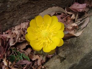 子の権現に到着する直前に南向きの斜面を通った。枯れ葉の中に黄色い花が見える。「これ、福寿草よ」とエーデルワイズさんが興奮気味に声を出す。最初は一輪福寿草を見つけて興奮したが、よく斜面を見ると点々と群れをなして黄色い花が咲いている。思わず「わあ、すごい!!」と大きな声を出してしまった。まだ1月14日なのにこんなに福寿草がふんだんに花をつけていることに感動した。すごく嬉しくなった。先日も黄色いろうばいから元気をもらったばかりだ。真冬に咲く鮮明な黄色い花が心のカンフル剤になっている。この日一番のサプライズだった。