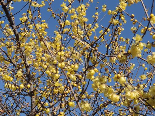 久し振りにウォーキングに出かけた。民家の庭先にろうばいが鮮やかな黄色の花をたくさんつけていているのを見つけた。真っ青な冬晴れの空をバックに小さく丸い花がたくさん広がって辺りの景色まで明るく感じられた。昨年も通ったお家である。 まだ真冬なのにもうこんなに春を感じさせるきれいな色の花が咲いているのに驚いた。このところのめげっぱなしの心が少しリフレッシュされ、力をもらった。