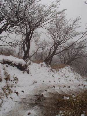 1月24日丹沢へトレーニング山行に行った。ルートは大倉尾根から塔の岳の往復。連続する登りで大腿四頭筋を鍛えるには丁度良い。天気予報は悪くなかったのにいざ大倉を出てしばらくしたら、もう雲が厚くどんよりとして何も見えなくなった。さらに小雪がちらちら舞い始め、金冷まし辺りは道が凍結状態だったので軽アイゼンを装着。気温が低いので地面は固いまま、12月のようにどろんこにならず助かった。塔の岳山頂は雪は少なく強風でもないのにメチャ寒かったし、視界もきかなかった。尊仏山荘でカップラーメンを食べた。ストーブ前の一等席をずっと猫が占領していたのがおかしかった。 山頂直下の道 得意の覆面で寒さを防いで 寒そうな塔の岳山頂周辺一息ついて下山。花咲かず鳥泣かず山見えずで本当にトレーニングだけの1日だった。途中の小屋で薪割りをしていたので写真を撮らせてもらった。とてもお上手でした。 尊仏山荘の猫16歳 薪割り