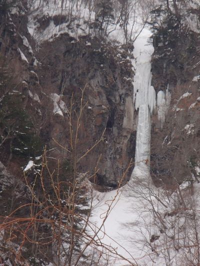 2月25日いよいよ目標の夢のブライダルベール登攀の日を迎えた。5時起床6時朝食7時出発。2ルンゼに入る道を過ぎ、3ルンゼの登り口までくると遙か上に白い氷瀑が見えた。夢ブラだ。心を躍らせながら3ルンゼを詰める。ここもデブリが連なっていたが2ルンゼほどの急登でなくて安堵した。しばらく登ると右側に滑滝、正面にアーリースプリングのスレンダーな姿が見える。その左にドーンと大迫力の夢ブラが見える。 夢のブライダルベール 全景 滑滝 アーリースプリングすごい!!。遂に夢ブラを見た。長さ150m、滝が流れ始める上部は遙か上でどうなっているのか肉眼でははっきり捉えられない。下部のエプロンは青みを帯びて豊かに張り、中間部はスカートのギャザーのようにとっても繊細で美しい。最上部は首のように細く、繋がっているのかどうか?でも少なくとも2ピッチ目終わりまでは昇れる。最後はいってみなければ確定できない。装備を調え登攀開始。遂にこの時が来た。 夢ブラ 第一ピッチ 洞窟前 何て美しいギャザーの広がり!! 1ピッチ目50m 快適に昇った 洞窟前に到着氷は程よい堅さでアックスがよく決まり、足も安定していてとても昇りやすく快適だった。ただけっこう長かった。天然の要塞・洞窟に入ってビレイ。この洞窟はすばらしかった。つららが緞帳のように荘重に下がってまるでカーテンの中で出番を待つ俳優になった気分だった。 洞窟の中、Vスレッドでビレイ 巨大なつららが洞窟を護っている2ピッチ目は洞窟を左に出て開始。通常ここが核心と言われてきたが、氷の状態がよく苦労しないで快適に昇れてすごく嬉しかった。天は私に微笑んでくれた。 2P 出だし 核心を抜けてきたところ気持ち良く2ピッチ目を昇って木の枝でビレイ。本日の課題はこの先3ピッチ目がどうなっているかである。Kガイドが昇り始めてしばらく「何の問題もないよ」という声が聞こえ一安心。枯れ木の横からトラバースして本ルートに取り付く。立ってはいるが特に問題はない。途中から左側の細い氷柱にトラバースする部分を慎重にこなすと後はそのまま昇って終了点に到着した。やったあ、全部昇れた!!喜びがこみ上げてKガイドとハイタッチした。すべてが最高だった。そして終了点付近の狭い滝の落ち口があの見事な氷瀑に成長したんだと思うと自然の造形に感動を覚えずにはいられなかった。 3ピッチ目 終了点直下 やったね!!寒さに震えず手もこごえず、風も無く、氷の状態もベスト。この上望むことのないコンディションに恵まれて登攀が完了した。予想以上の素敵な日が訪れた。しかしここで気を抜いては危ない。まだ下降が残っていると気を引き締めて、氷瀑上を3Pの懸垂下降。下りながらこんな氷を昇ってこれたんだと感慨無量だった。 終了点で宮田さんと 夢ブラのど真ん中で無事着地して改めて見直してもやはり見事な氷瀑だった。巨大で迫力があり、その上美しい。 登攀記念写真 私を鍛えてくれたKガイドと
